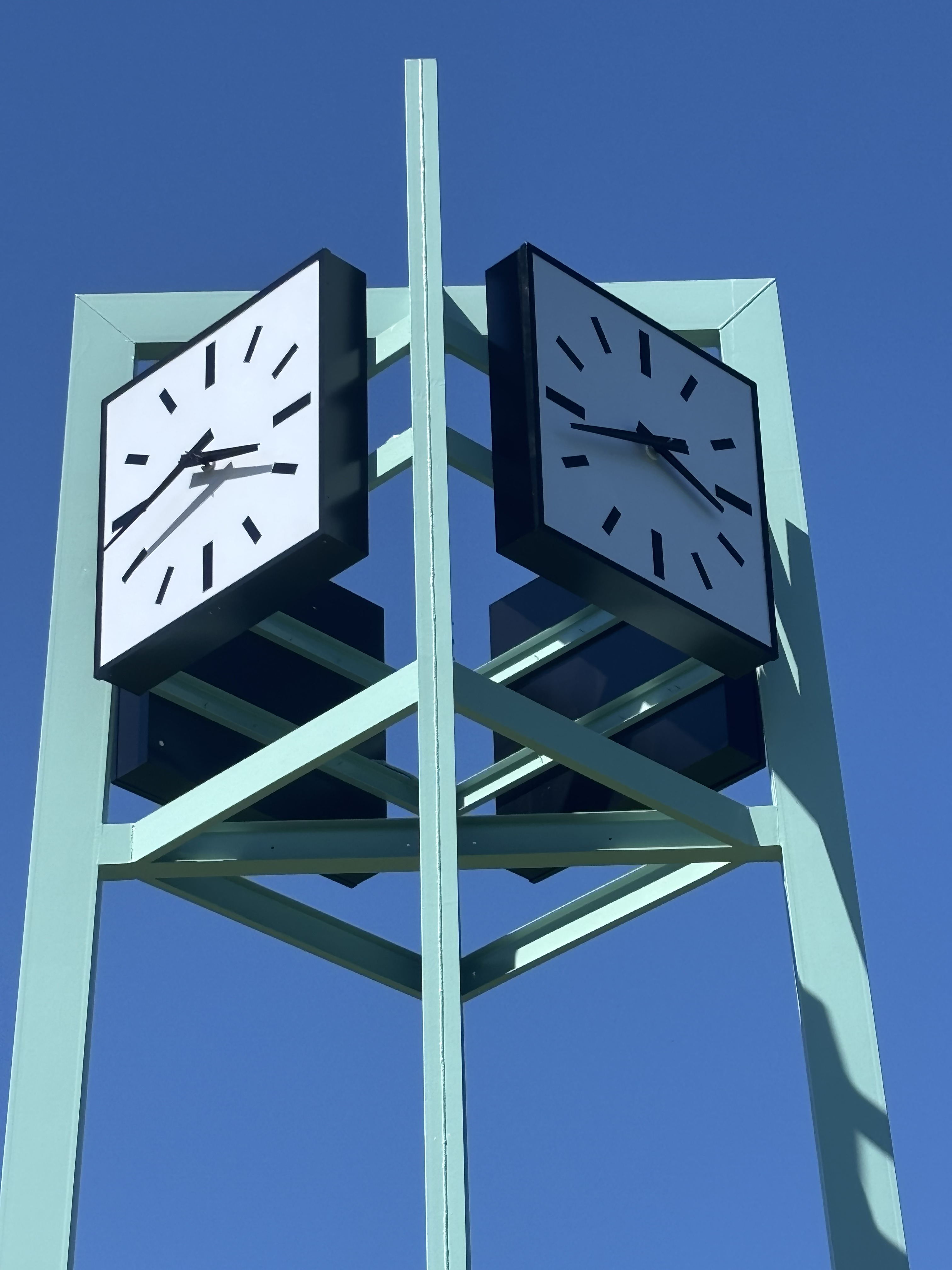 Canister clock with coverglass for elementary school clock tower, Tama IA -