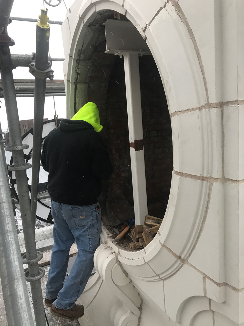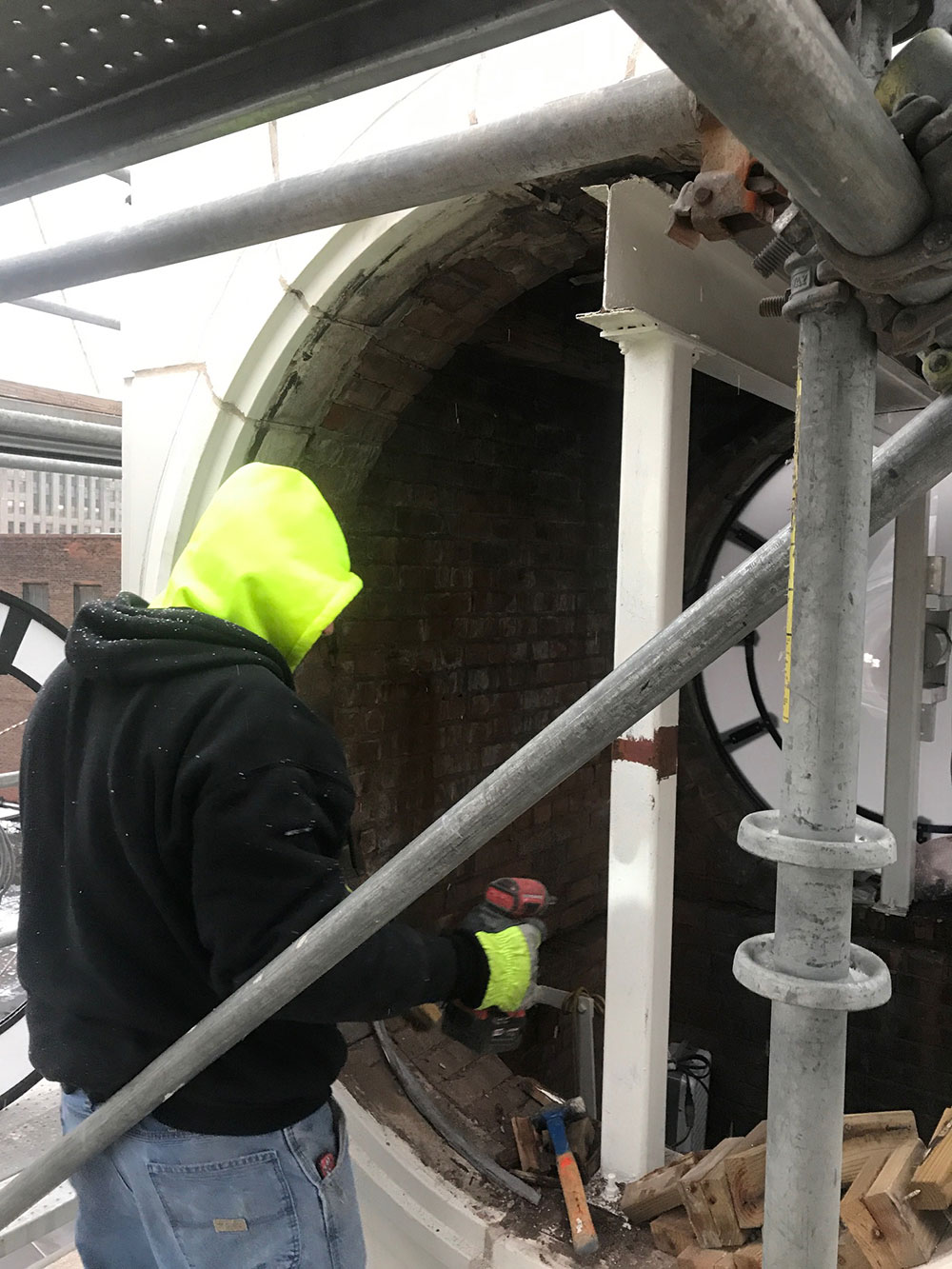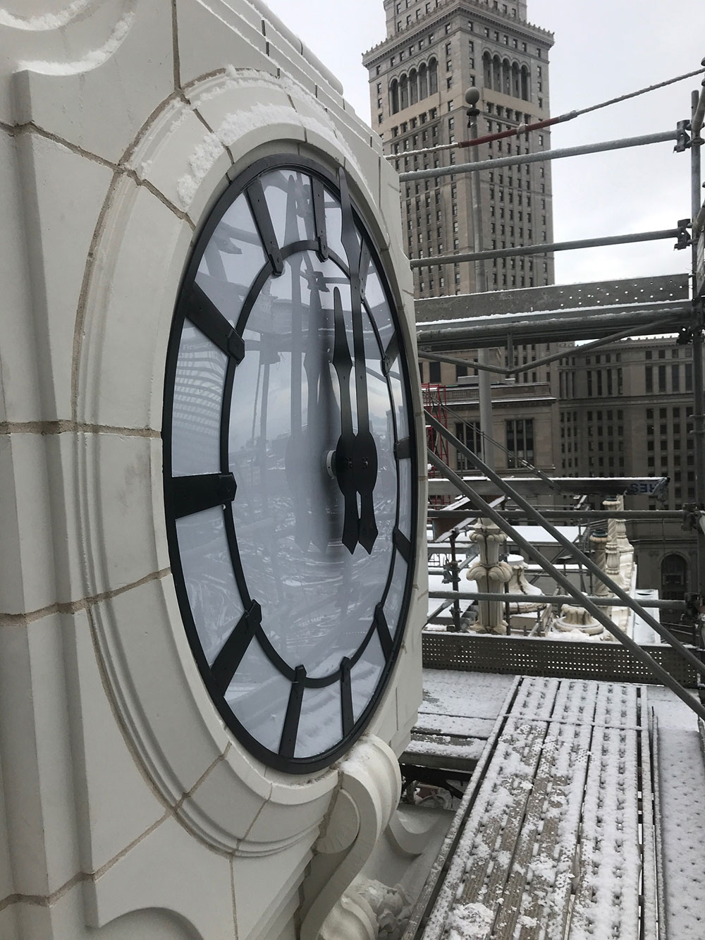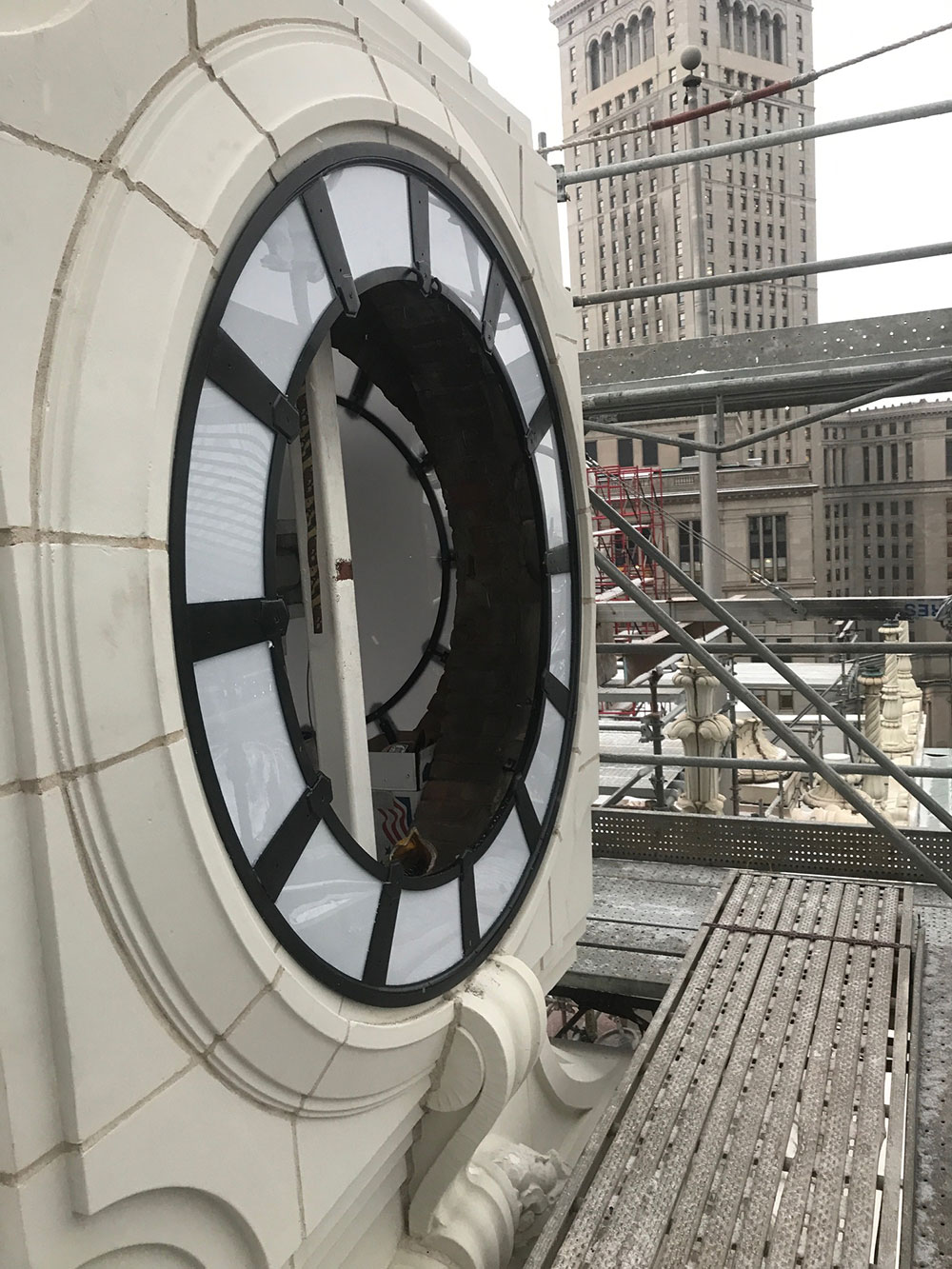 After removing the putty that held the original glass, layers of old paint were media-blasted to reveal the underlying surface. New primer and paints in satin black were applied to replicate the original appearance. Given the site’s location near Lake Erie, new white polycarbonate inserts were installed to withstand the extreme wind and cold coming which is visible from the clock tower.