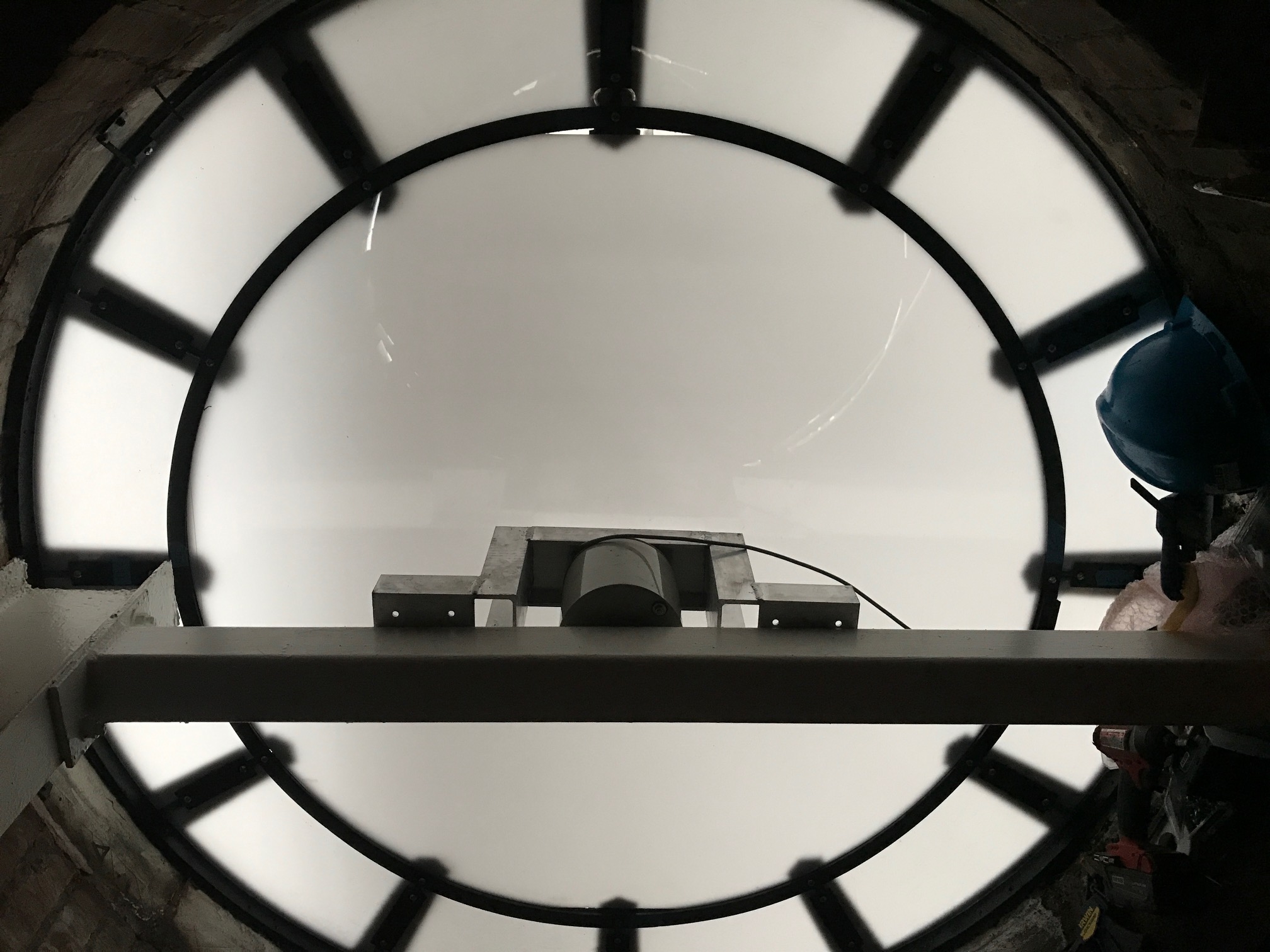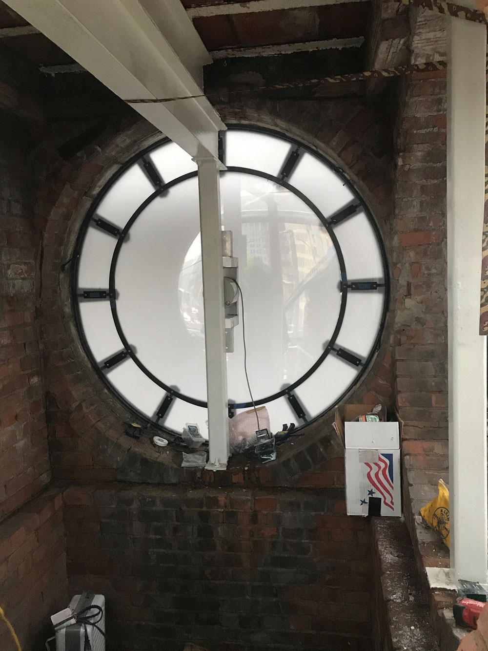 Once the restoration process was complete, the clocks were dispatched to site. The 900-pound crate was brought up in a freight elevator to deliver the now-restored historical clocks to their final resting place. Topping off their restored appearance, new white LED light panels were installed from the backside, adding additional utility to the clocks.